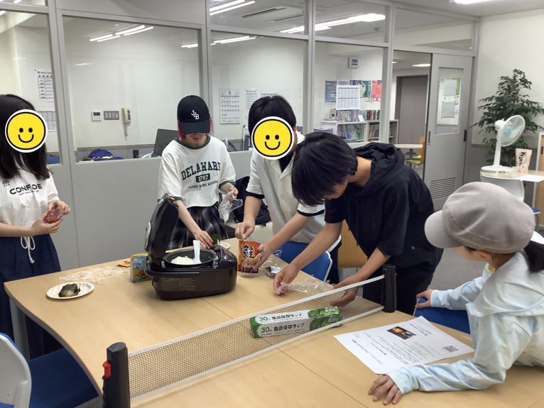 いい塩梅で大根に火が通ったところで味噌を投入。ここでも味見しながら味噌の量を調整してできあがり!その頃、ちょうどご飯が炊きあがったので、各自で自分の分のおにぎりづくり。買ってきたラップが安物だったせいか、全然スパッと切れず、みんなラップを切るのに悪戦苦闘していました。