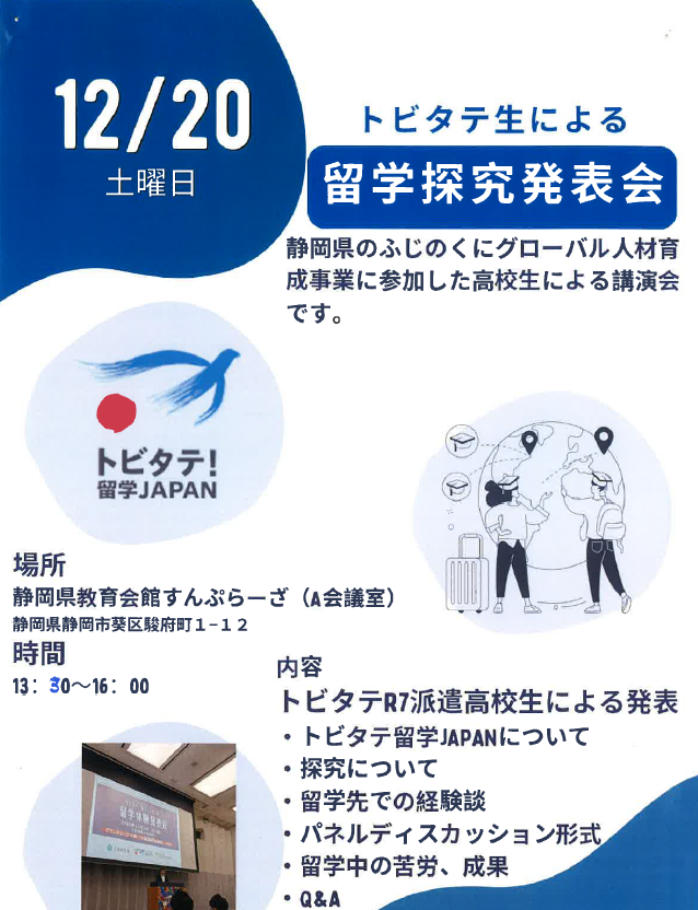 以前、こちらのブログに今年の3月にNEO高のフリースクールを卒業し、高校に進学したSさんが、「トビタテ生」としてオーストラリアへ留学して、お土産をもってきてくれたことを書きました。そのSさんが、同じくトビタテ留学した他の学生に声をかけて「留学探求発表会」を自主開催するとのことで、リーフレットをもってきてくれました。各トビタテ生の体験談や、パネルディスカッションを行うとのことですので、留学に興味のある方はぜひ会場に足をお運びください。